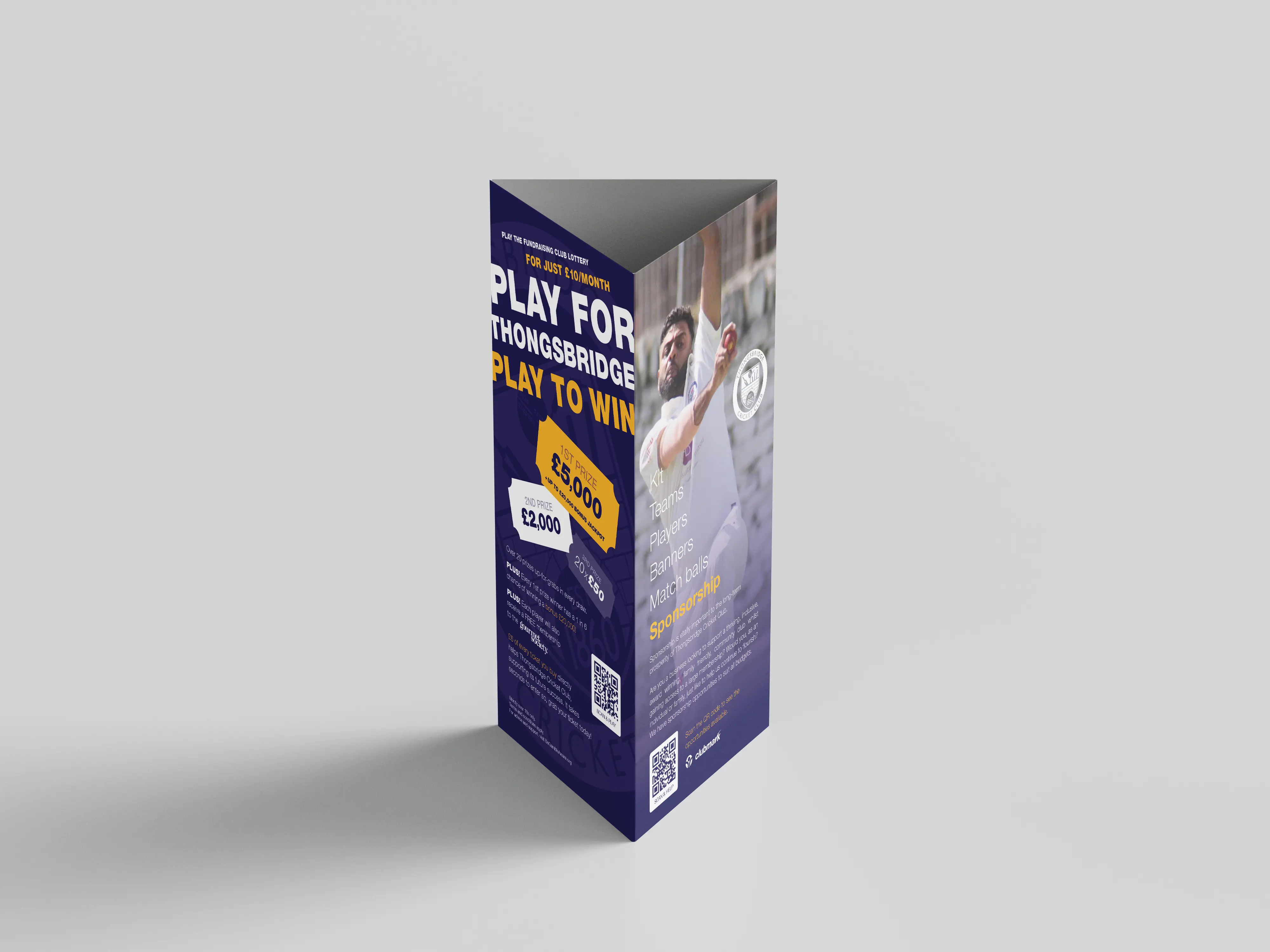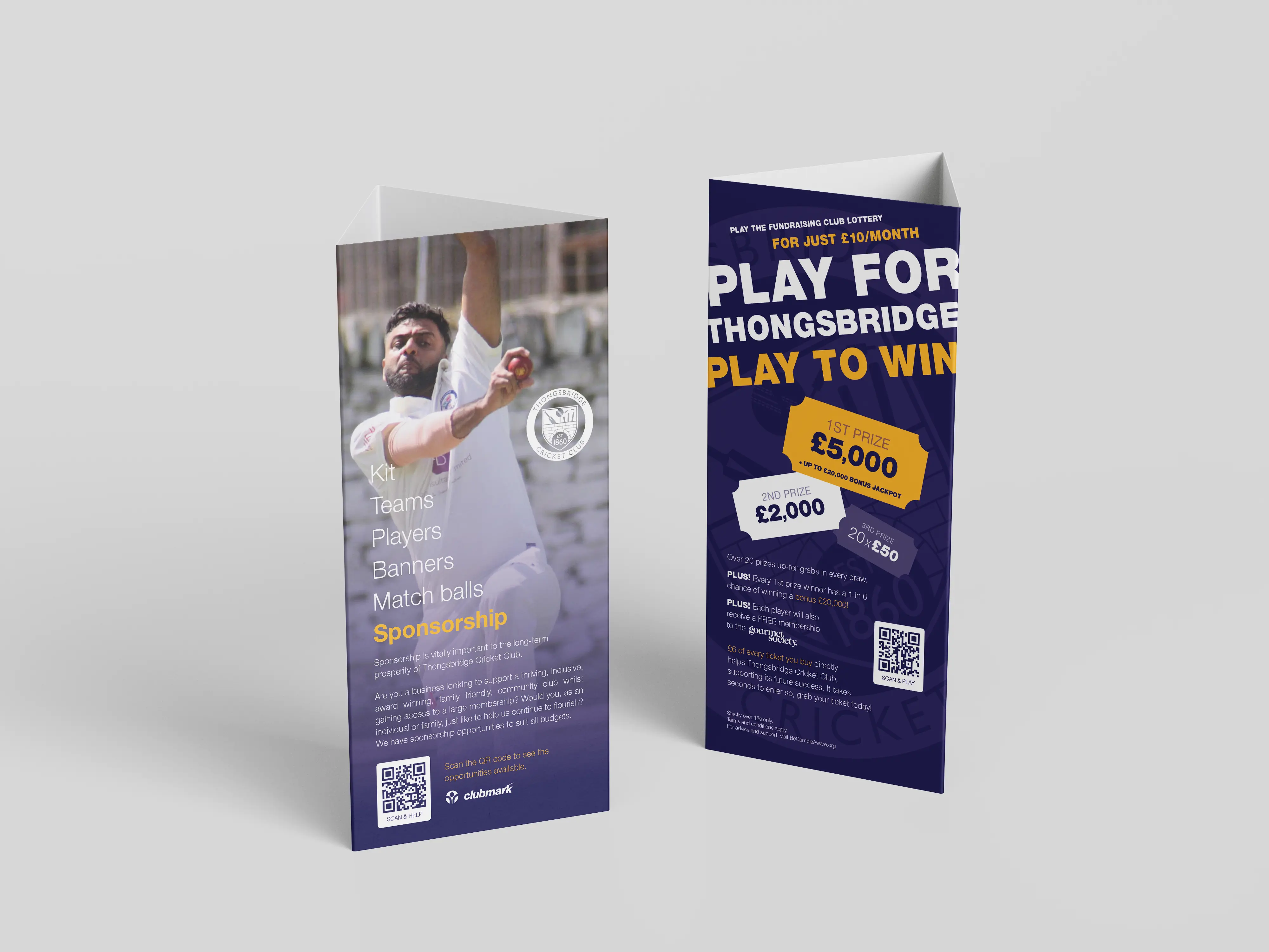 3-sided DL Table Talkers on NeverTear to promote Thongsbridge Cricket Club’s fundraising opportunities to members and visitors 3 sided DL Table Talkers on NeverTear to promote Thongsbridge Cricket Club's fundraising opportunities Creative direction Illustrator InDesign Photography Photoshop Print design Project management View more projects
