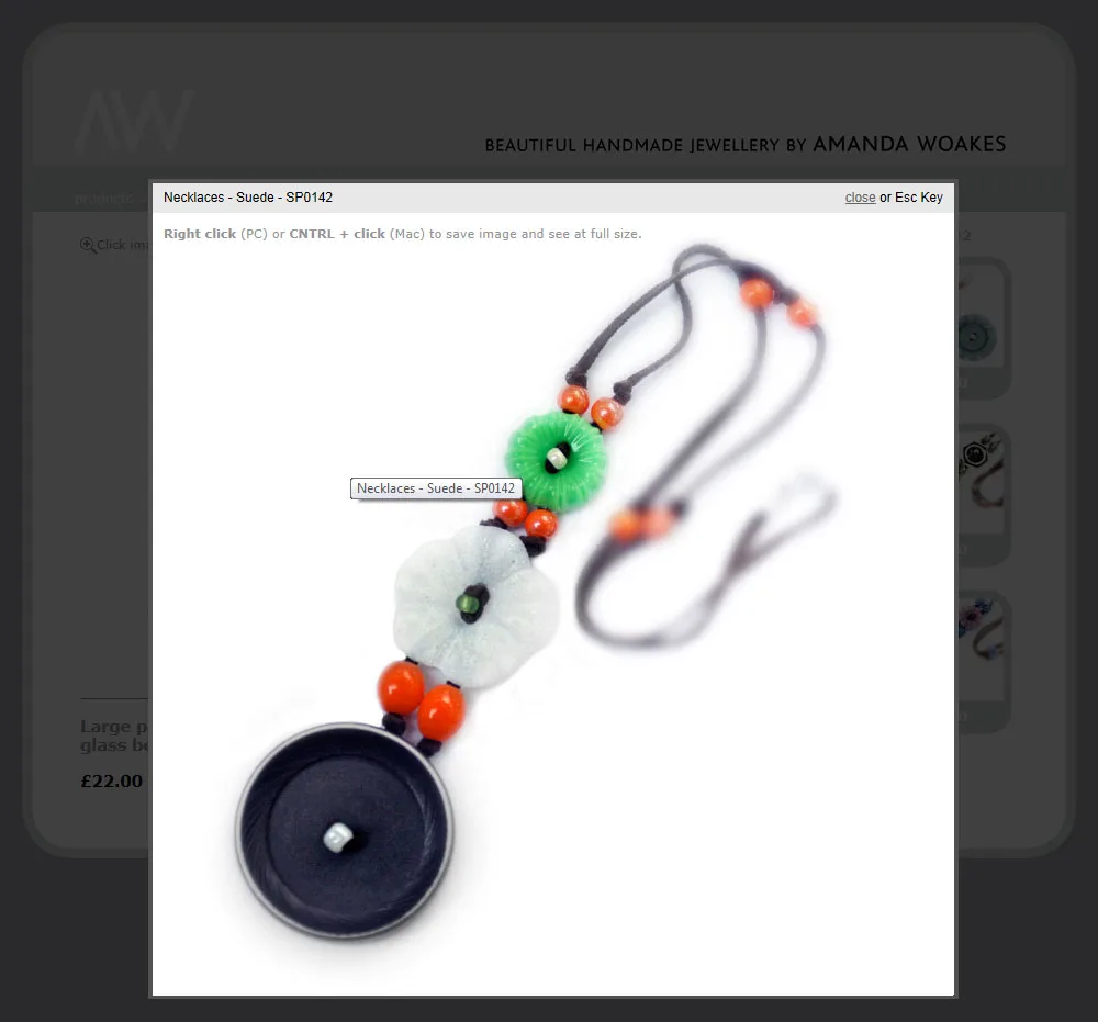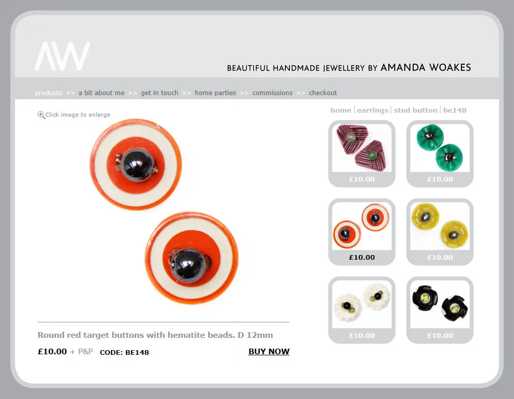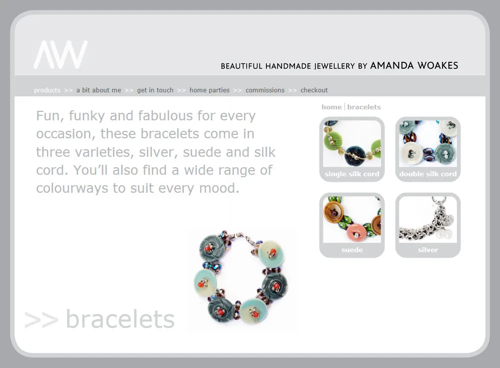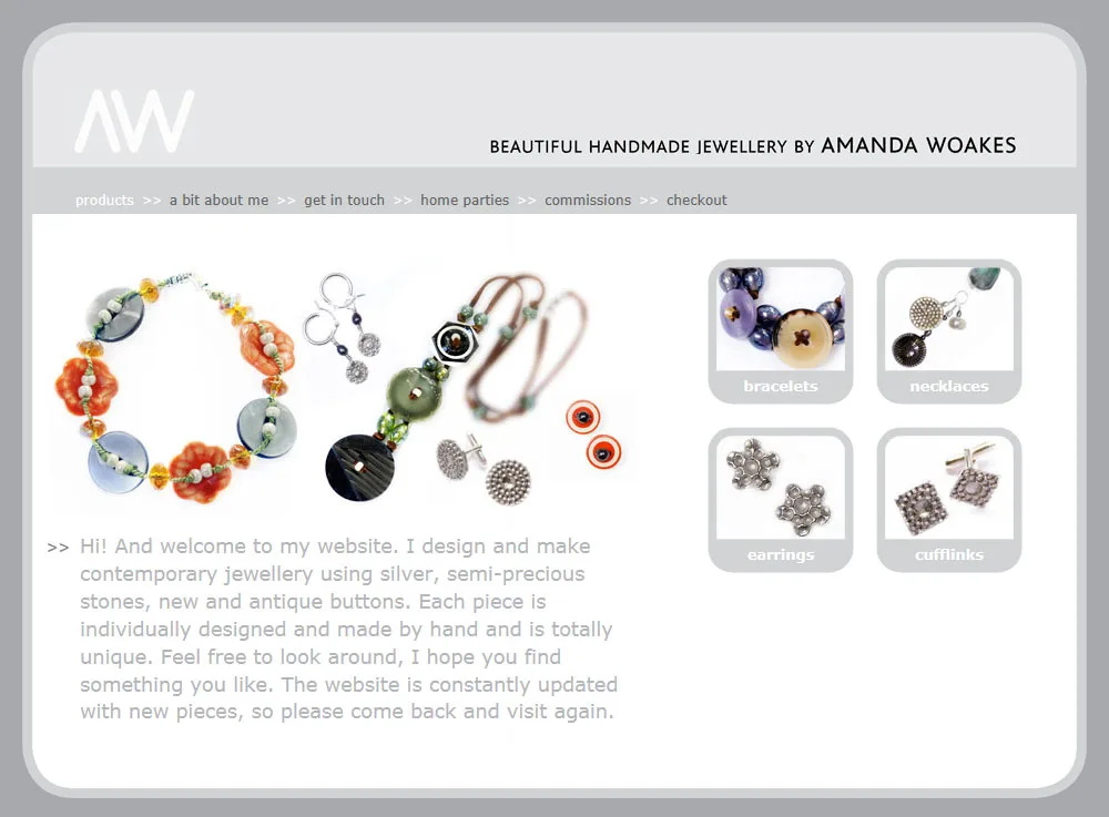 Amanda Woakes Handmade Jewellery website Classic ASP website for Amanda Woakes Handmade Jewellery with bespoke product CMS and PayPal shopping cart - based on supplied designs. Classic ASP CSS Dreamweaver HTML jQuery View more projects