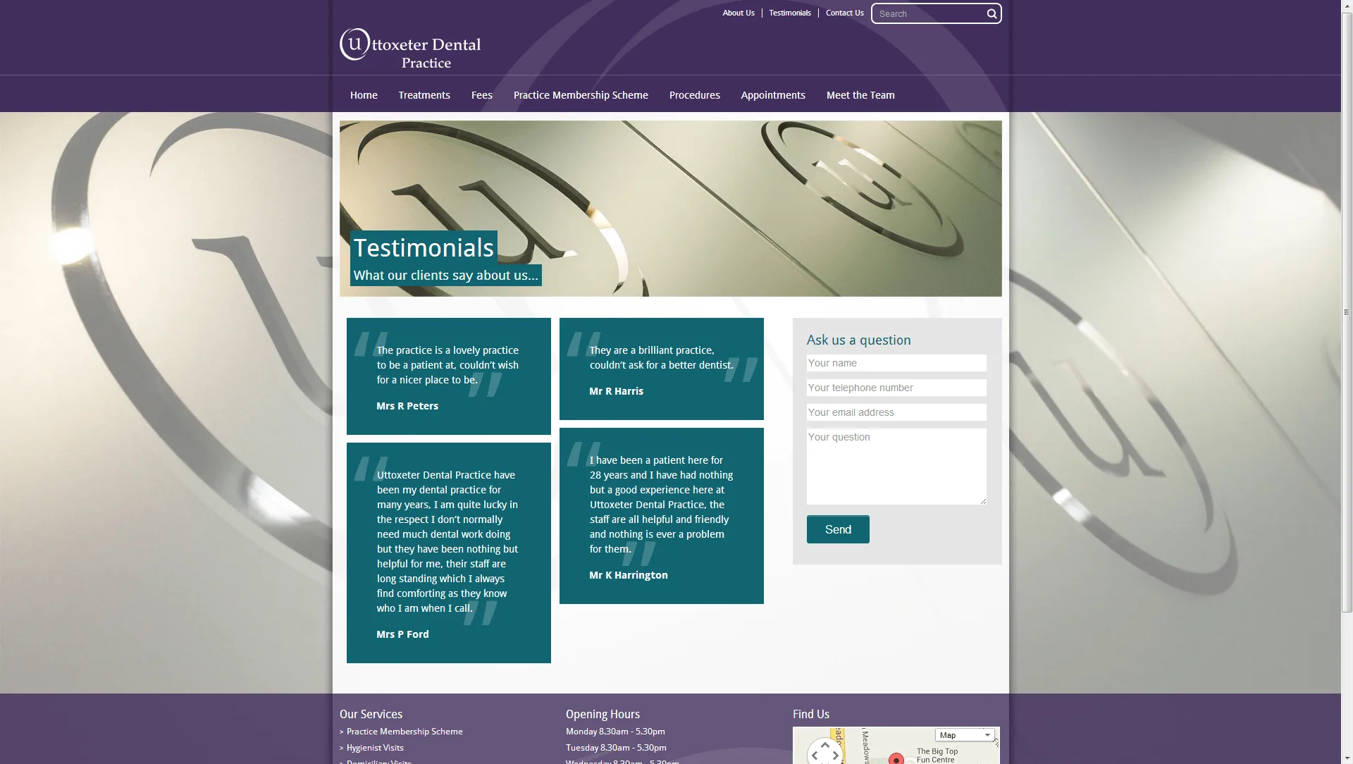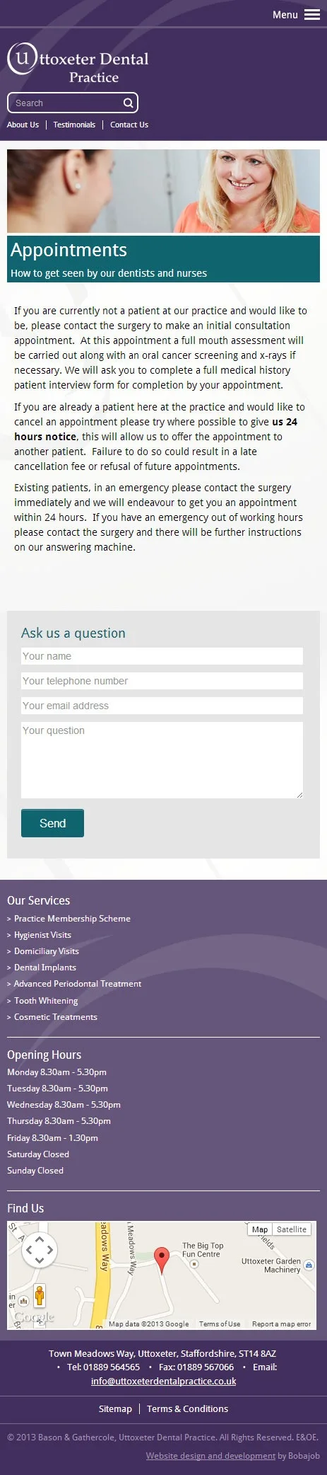 Uttoxeter Dental Practice responsive WordPress website An HTML5, CSS3 and Jquery responsive Wordpress website for Uttoxeter Dental Practice. CSS3 Dreamweaver HTML5 jQuery mySQL Photoshop PHP Website design Wordpress View more projects